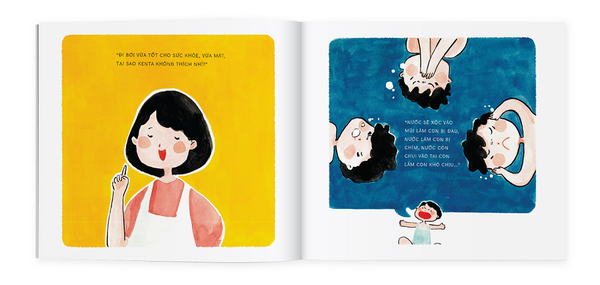 À, hóa ra bạn ấy sợ rằng nước xộc vào mũi sẽ làm bạn ấy bị đau, nước chui vào tai làm bạn ấy khó chịu và nước còn nhấn chìm bạn ấy nữa. Nếu như đi học bơi, các vấn đề này sẽ được giải quyết gọn luôn đấy, Kenta biết chưa nhỉ? “Nhưng nếu con học bơi, con sẽ biết cách thở làm sao để không bị đau mũi, cách làm sao để dễ dàng nổi trên mặt nước và sẽ có mũ bơi để nước không bị vào tai nữa” – mẹ giải thích và kiên quyết đăng ký học bơi cho Kenta.